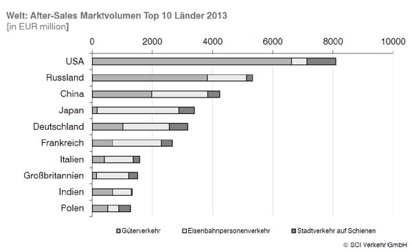Das aktuelle Marktvolumen für After-Sales-Services beträgt etwa 49 Mrd. EUR und wächst bis zum Jahr 2018 mit durchschnittlich 3,7 % pro Jahr. Damit hat der Instandhaltungsmarkt etwa das gleiche Volumen wie der Neufahrzeugmarkt, ist aber aufgrund seiner deutlich geringeren Volatilität durch langfristige Vertragsabschlüsse von besonderem strategischen Interesse für die Bahnindustrie. Durch Flottenerweiterungen und –aufwertungen hinsichtlich Geschwindigkeit und Ausstattungsniveau wächst das Marktvolumen in allen Weltmarktregionen. Trotzdem bleibt Asien Motor des deutlichen Wachstums, vor allen anderen Ländermärkten treibt hier China mit Wachstumsraten von 10% jährlich an. Hintergrund sind die erheblichen Investitionen in den Hochgeschwindigkeitsverkehr sowie der Bau zahlreicher Metrolinien in den Großstädten des Landes, um den negativen Auswirkungen der starken Zunahme des motorisierten Individualverkehrs zu begegnen. Analog sorgen in Afrika/Naher Osten ebenfalls Hochgeschwindigkeitsverkehre und Metrosysteme für ein spürbares Wachstum im After-Sales-Markt.