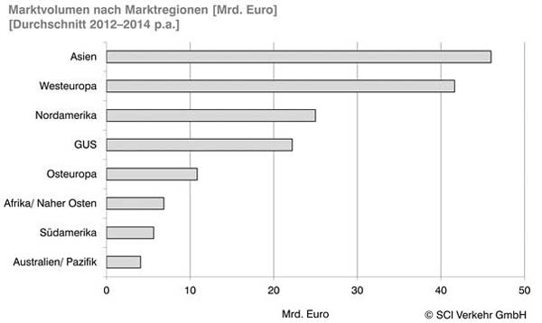 SCI: Neue Studie zum Weltmarkt BahntechnikStadtverkehr bestimmt das Wachstum der nächsten fünf Jahre – Neugeschäft deutlich belebt – Spezialisten unter den Herstellern besonders dynamischDas Marktvolumen der weltweiten Bahntechnik beträgt aktuell 162 Mrd. EUR - davon gut die Hälfte aus dem After-Sales-Bereich. Es wächst bis 2018 mit 3,4% auf über 190 Mrd. EUR. Dabei generiert sich das Wachstum gleichermaßen aus dem Neugeschäft und dem After-Sales. Die mit Abstand größten Wachstumsimpulse kommen mit einem erwarteten CAGR von 7% aus dem Stadtverkehr, während der Hochgeschwindigkeitsverkehr erwartungsgemäß nur noch im After-Sales-Geschäft wächst. Bei den Fahrzeugherstellern sind die spezialisierten Hersteller in den letzten Jahren besonders dynamisch gewachsen und setzen die etablierten Global Player weiter unter Druck. Die Wettbewerbsintensität wächst deutlich – auch durch die chinesischen Hersteller, welche immer stärker auf die Märkte außerhalb ihres eigenen Landes drängen. Der asiatische Bahnmarkt, mit einem Marktvolumen von 46 Mrd. Euro größter Bahnmarkt weltweit, wächst wieder stärker. Die Region Afrika/Naher Osten hat mit einem Wachstum von über 10% weltweit die besten Wachstumsperspektiven.