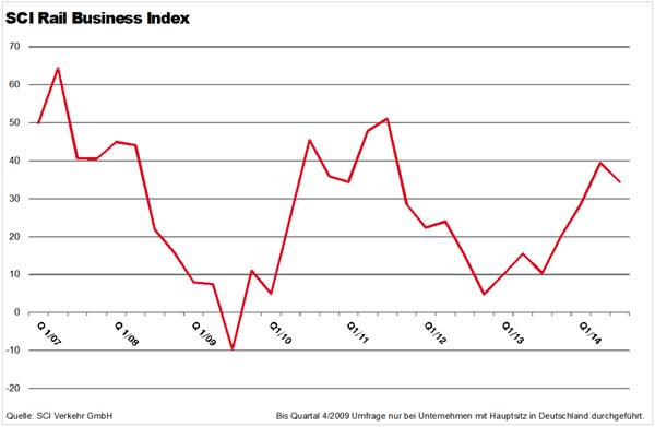 SCI Global Rail Index 3/2014Nachfrage nach Produkten der Bahnbranche spürbar eingebrochen – Gibt die InnoTrans 2014 neue Impulse?Die Stimmung führender Unternehmen der weltweiten Bahnbranche, welche durch den SCI Global Rail Index erfasst wird, ist zu Beginn der zweiten Jahreshälfte 2014 erstmals seit einem Jahr leicht getrübt. Die Bewertung der aktuellen Geschäftslage sowie die Aussicht auf das kommende Halbjahr werden insgesamt zurückhaltender beurteilt als noch vor einem Quartal. Besonders stark ist die Nachfrage nach Produkten und Leistungen, ein wichtiger Indikator der Branchenentwicklung, eingebrochen. Neben der schwachen Wirtschaftslage in Europa trüben vor allem die Sanktionen gegen Russland in Folge der Ukrainekrise die Stimmung der westlichen Bahnindustrie. Geschäfte im wichtigen russischen Bahnmarkt drohen künftig an die Konkurrenz in Asien verloren zu gehen.