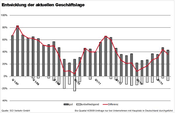 Der seit Anfang 2013 andauernde Aufwärtstrend der aktuellen Geschäftslage wird im dritten Quartal 2014 vorerst gestoppt. Zwar beurteilt immer noch ein hoher Anteil der befragten Top-Manager die aktuelle Geschäftslage positiv, im Vergleich zum Vorquartal zeigt sich jedoch erstmals ein leichter Rückgang um 5 Prozentpunkte. Hierfür ist vor allem die Entwicklung in den letzten 3 Monaten verantwortlich. Nur noch eine knappe Mehrheit der Befragten gibt an, dass sich ihre Geschäftslage in diesem Zeitraum verbessert hat. Inwieweit die Bahnbranche vor anbrechenden schwierigen Zeiten steht, werden erst die kommenden Befragungen des SCI Railindex zeigen. Die krisenhaften Entwicklungen in Russland oder im Nahen Osten verunsichern die Branche jedoch.