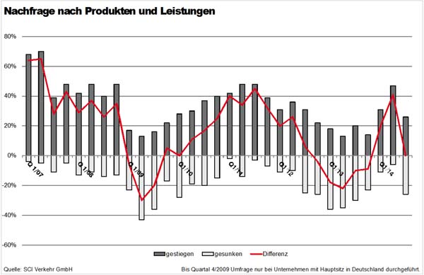 Die Nachfrage nach Produkten und Leistungen ist ein wichtiger Indikator für die Lage der Bahnbranche. Der zwischenzeitliche Höhenflug durch zahlreiche wichtige Neuaufträge Anfang 2014 wird in der aktuellen Befragung jäh gestoppt. Im Vergleich zum zweiten Quartal 2014 geben nur noch halb so viele Top-Manager eine gestiegene Nachfrage an. Ein Viertel aller Befragten berichtet hingegen von rückläufigen Auftragseingängen. SCI Verkehr sieht vor allem die derzeitigen wirtschaftlichen Unsicherheiten als Grund für den Bestellrückgang. Auch in der Beurteilung des aktuellen Auftragsbestandes werden die Spitzenwerte der ersten beiden Quartale 2014 nicht mehr erreicht.
