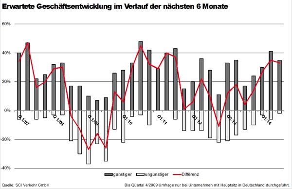 Trotz des spürbaren Rückganges des wichtigen Indikators Nachfrageentwicklung hat sich die Beurteilung der künftigen Geschäftsentwicklung nur gering getrübt. Im Saldo sehen noch etwa 35% der befragten Manager eine günstigere Geschäftsentwicklung. Kaum ein Befragter fürchtet eine schlechtere Entwicklung seiner Geschäfte. Die Unternehmen setzen ihre Hoffnung auf die Ende September anstehende führende Bahnmesse InnoTrans in Berlin. Beim „Get-together“ der weltweiten Bahnbranche erhoffen sie sich neue Geschäftskontakte und Aufträge, welche die Bücher wieder füllen. Erst die kommenden Quartale werden zeigen, inwieweit diese Hoffnung begründet ist.
