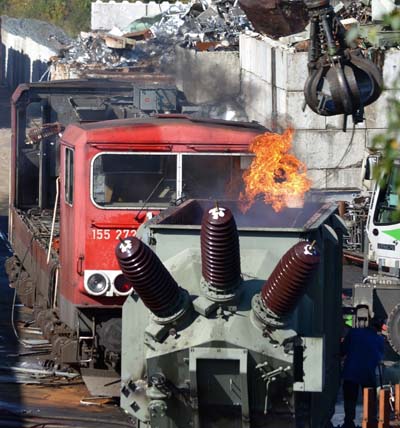 155 272 ist GeschichteUnd immer weiter geht der Zerlegungswahn….155 272 während der Zerlegung am 17.09.2014 beim Bender, ++ 18.09.2014. Vorn wird parallel ein ausgemeusterter Trafo verschrottet, bei dem noch etwas Restöl abfackelt….. / 155 105 ist die nächste in der Reihe, wird heute am 19.09. zerlegt. Quelle:/Fotos: Markus Tigges | |