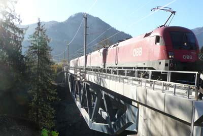 Pyhrnbahn: Neue Brücken in Betrieb genommen Erfolgreiche Probebelastung und Inbetriebnahme der neuen Eisenbahnbrücken auf der PyhrnbahnSeit 3. November 2014 fahren die Züge über die neue Teichl- und Steyrbrücke Am 2. November fand die erfolgreiche Belastungsprobe, mit gleichzeitig insgesamt fünf Lokomotiven, der beiden neu errichteten Eisenbahnbrücken über die Steyr und Teichl auf der Pyhrnbahn bei St. Pankraz statt. Mehrerer Stunden fanden Versuche statt, um das Verhalten der beiden Brücken unter realen Einwirkungsbedingungen zu prüfen Dabei wurden jeweils die Durchbiegungen der beiden Brücken unter verschiedenen Laststellungen von mehreren Lokomotiven in vertikaler Richtung gemessen, sowie die Verschiebungen der Widerlager in Folge von Brems- und Anfahrvorgängen in Brückenlängsrichtung. Dazu wurden die Lokomotiven zusammengespannt, was einem Gesamtgewicht von rund 440Tonnen entsprach. Test mit „Sehr gut“ bestanden Bei beiden Brücken entsprachen die Messergebnisse den gestellten Vorgaben. Somit konnten mit dem heutigen Tag über beide Brücken, termingerecht nach 16 Monaten Bauzeit, wieder die Züge rollen. Beide Brückenneubauten konnten parallel zum laufenden Bahnbetrieb auf der Pyhrnbahn erfolgen. Nur im Oktober 2014 war eine geplante einmonatige Streckensperre dafür notwendig. Quelle:/Fotos: ÖBB | |