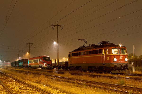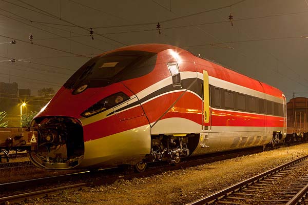 Nach rund einem halben Jahr Pause hat der italienische Triebfahrzeughersteller Ansaldobreda das zweite Mal begonnen, Elemente eines für die Italienischen Staatsbahnen gebauten Triebwagens der Type ETR 1000 zu Testzwecken in den Klima- Windkanal der Railtec Arsenal in Wien zu entsenden. Den Beginn machte der Endwagen einer solchen Garnitur, welcher im Schlepp von 1142 567 während der späten Abendstunden am Floridsdorfer Frachtenbahnhof angekommen ist. Die Belegaufnahme zeigt den Zugverband nach dessen unmittelbarer Ankunft.