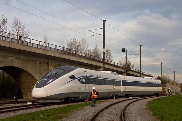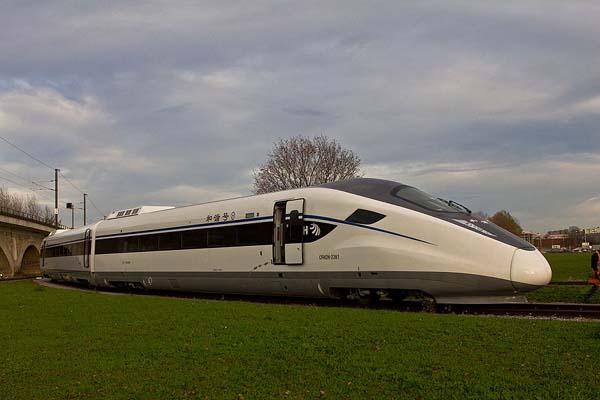 Das kam mir alles sehr chinesisch vor...Entgegen meiner seinerzeitigen Vermutung, wonach es sich bei jenen im Wiener Hafen verladenen Fahrzeuge um Elemente eines CRH380D handelt, wurde ich nunmehr eines besseren belehrt. Tatsächlich befanden sich unter der Folie zwei Elemente eines CRH2H, welche am heutigen Dienstag im unverhüllten Zustand etwas Frischluft geschnappt haben. Das habe ich mir natürlich nicht nehmen lassen, und so wurde gleich einige Male der Auslöser betätigt?