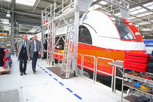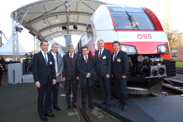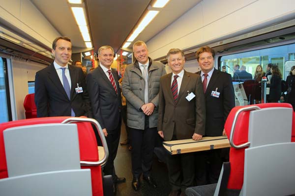 Desiro ÖBB cityjet vorgestellt![]() ![]() ![]() ![]() Der österreichische Bundesminister für Verkehr, Alois Stöger, und der CEO der Österreichischen Bundesbahnen (ÖBB), Christian Kern, präsentierten gemeinsam mit Jochen Eickholt, Bahnchef von Siemens, den neuen Regionaltriebzug vom Typ Desiro für Österreich im Siemens-Werk in Krefeld. Derzeit wird der erste Zug im Prüf- und Validationcenter in Wegberg-Wildenrath getestet. Im Januar 2015 beginnen die Tests im Klima-Wind-Kanal des Rail Tec Arsenals (RTA) in Wien. Ab März 2015 starten schließlich die Zulassungsfahrten. Die Inbetriebnahme ist für Herbst 2015 geplant. Die ÖBB haben im Frühling 2013 auf Basis einer EU-weiten Ausschreibung neue Züge für den Nah- und Regionalverkehr bestellt. Damit modernisieren die ÖBB ihre Fahrzeugflotte weiter. Die Endfertigung für rund zwei Drittel der Züge erfolgt, wie schon bei den railjets und den Taurus-Loks, in ÖBB-Werkstätten in Österreich. Die Drehgestelle kommen vom Siemens-Werk in Graz. 31 Züge sind für den S-Bahn-Verkehr in Wien und Niederösterreich vorgesehen, 35 Züge für den Regionalverkehr in Niederösterreich, 18 Züge für den Regionalverkehr in der Steiermark und 17 Züge den Regionalverkehr in Oberösterreich. Der ÖBB cityjet ist ein dreiteiliger elektrischer Triebzug, der in der S-Bahn-Version über 244 Sitzplätze und in der Regionalbahnversion über 259 Sitzplätze pro Zug verfügt. Bequeme Niederflureinstiege garantieren einen barrierefreien Zugang ohne Rampen auch für Rollstuhlfahrer und Familien mit Kinderwagen. Großes Augenmerk wird auf den Sitzkomfort gelegt: Fahrgäste entspannen sich in komfortablen, verstellbaren Sitzen mit Armlehnen und Fußstützen, eine auf die Sitzpositionen abgestimmte LED-Beleuchtung und Fahrgastinformation mit Bildschirmen im Wageninneren. Ergänzend sind Steckdosen, Tische und Fensterrollos vorgesehen. Die S-Bahnen erhalten sechs, die Regionalzüge vier Türen auf jeder Einstiegsseite. Der ÖBB cityjet erreicht eine Höchstgeschwindigkeit von 160 km/h. Im Vergleich zu bestehenden Fahrzeugen kann die Laufleistung zwischen den Wartungsintervallen bis zu dreimal höher sein. Die Zulassung des ÖBB cityjets wird in Österreich uneingeschränkt für alle Strecken erfolgen. Er wurde technisch angepasst, um auch Begegnungen mit 250 km/h schnellen Fernreisezügen problemlos zu ermöglichen. Ein hoher Wirkungsgrad der Antriebsanlage, elektrodynamisches regeneratives Bremsen mit Energierückspeisung, Abwärmenutzung des Antriebsystems für die Heizung der Fahrgasträume und ölfreie Kompressoren sorgen für einen effizienten und ressourcenschonenden Bahnbetrieb. Zusätzlich ist das Fahrzeug im Innen- und Außenbereich mit energieeffizienten LED-Lampen ausgestattet, eine lärmarme Vorheizanlage schützt die Anrainer, wenn der abgestellte Zug in der Nacht für die Fahrgäste aufgewärmt wird. CO2-Fühler stellen den Besetzungsgrad des Fahrzeugs fest und sorgen für eine umweltfreundliche Steuerung der redundanten Klimaanlage, ohne den Fahrgastkomfort zu beeinträchtigen. Die Triebfahrzeugführer werden durch technische Einrichtungen beim Energiesparen im Fahrbetrieb und Abstellbetrieb unterstützt. Die ÖBB werden ab Dezember 2015 monatlich bis zu fünf Züge übernehmen und in den Dienst stellen. Im Januar 2018 soll der vorläufig letzte Zug an die ÖBB gehen. Alle Züge erhalten eine uneingeschränkte Zulassung für Deutschland, sie entsprechen den neuesten europäischen Interoperabilitätsrichtlinien (TSI). Quelle:/Fotos: Siemens | |