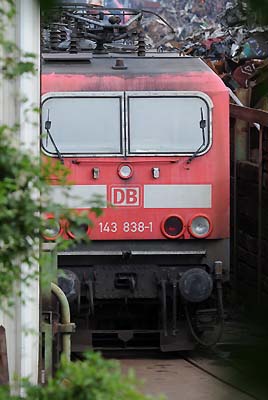 Anbei noch ein Bild der 143 838-1, wie sie hinter dem Tor im Steil-Gelände steht, aufgenommen am 09.07.09.