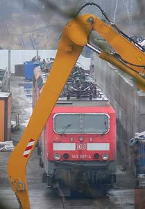 Bender, 22.02.2009![]() 143 097, DB Regio AG Hessen, z 27.10.2006, lange Zeit in Darmstadt Hbf abgestellt. 143 xxx 110 405, DB Regio AG Hessen, seit 10.08.2006 z-gestellt Die 143 656 ist bis auf den Rahmen zerlegt, der auch nur noch in losen Stücken auf den Drehgestellen liegt ![]() ![]() Quelle:/Fotos: Markus Tigges |
