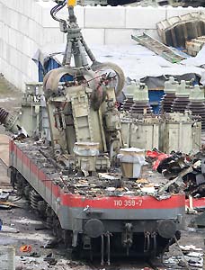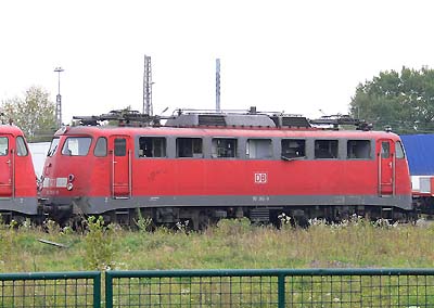Bender, 24.10.2008 110 359 ++ 24.10.2008Wie ein festsitzender Weissheitszahn wird der Haupttransformator der 110 359 aus seiner Verankerung gerissen, der Greifer geht bei der Aktion an seine Belastungsgrenze. Einige (abgeklebte) Bauteile scheinen als Ersatzteile an die Bahn zurückzugehen Überstellt zum Bender 23.10.2008 110 382-9 (Bh Köln-Deutzerfeld), 110 368-8 (Bh Köln-Deutzerfeld), 110 339-9 (Bh Dortmund Bbf), 110 482-7 (Bh Dortmund Bbf). Die 4 Bügelfalten standen am 24.10. noch vor den Bender Toren im „Grünen“. Mit den Vorarbeiten an 110 382 wurde bereits begonnen. ![]() ![]() ![]() ![]() Quelle:/Fotos: Markus Tigges | |