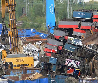 Bender, Opladen 25.09.2008![]() ![]() Am Nachmittag bereits war 110 318 in handlichen Teilen auf dem Ellokfriedhof, zusammen mit 110 286 und 110 381.Bei der 115 156 sind am Nachmittag des 25.09. bereits der Kasten und der komplette Rahmen mit dem Schneidbrenner zerteilt, dahinter wartet 110 356. Quelle:/Fotos: Markus Tigges | |