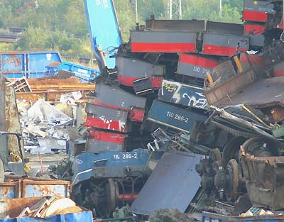 Bender, Opladen 25.09.2008![]() ![]() Es geht unvermindert weiter 110 286 ++ 23.09.2008 110 381 ++ 24.09.2008 110 318 ++ 25.09.2008 115 156 ++ 26.09.2008 Aktuelle Aufnahmen dazu: Am Donnerstag Vormittag wurde mit der Verschrottung der letzten o/b 110.3, der 110 318 (zuletzt DB Autozug, Bh Rummelsburg, daher intern unter 115 318 geführt), begonnen. Die Überreste der zuvor zerlegten 110 286 und 110 381 konnten säuberlich gestapelt auf dem „Friedhof“ entdeckt werden, der von Zeit zu Zeit zur Schmelze gefahren wird (per LKW versteht sich ...) Quelle:/Fotos: Markus Tigges | |