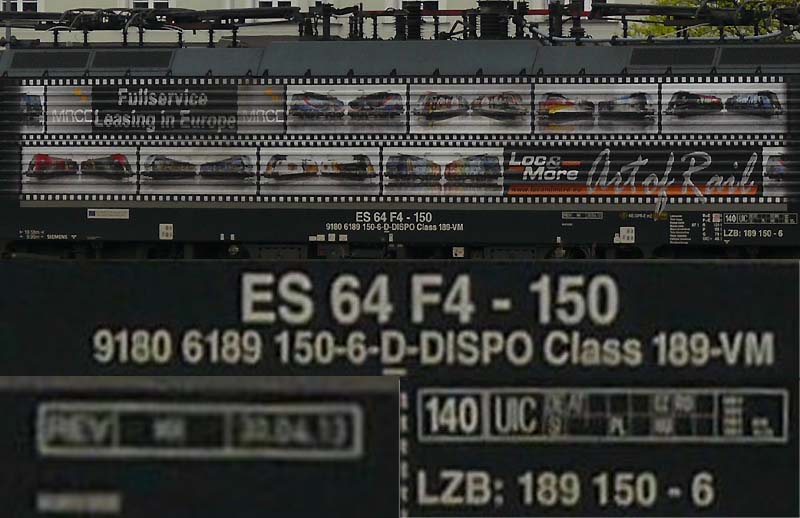 Daten und Details 189 150ES 64 F4-150 9180 6 189 150-6 D-DISPO Class 189 VM UIC: DE-AT-SL-PL-CZ-HU-RO REV MH 30.04.2013 LZB: 189 150-6 (aufgenommen am 10. April 2016) Quelle:/Fotos: Heiner & Sascha Prochazka | |
