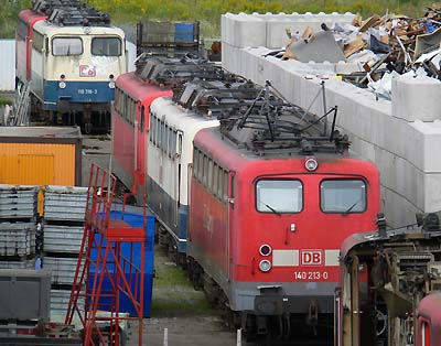 Bender, Opladen 07.09.2008![]() ![]() 140 213, 110 286 (ob) , 110 381, 110 318 (ob) und 115 156 warten auf dem Bender-Gelände auf den Schneidbrenner, davor wird 140 196 zerlegt und 143 334 steht noch immer am Stutzenende. Quelle:/Fotos: Markus Tigges | |