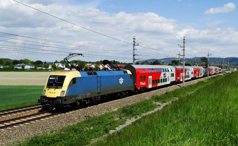 Ungewöhnliche aber planmäßige Doppelbespannung auf der FJB-BahnAn Sonntagen kommt es beim REX 2114 "Nebelstein" von Wien FJBF nach Ceske Velenice zu einer Doppelbespannung mit 470er der MAV-START. START 470.005 sowie die als Zwischentriebfahrzeug gereihte 470.004 mit REX 2114 "Nebelstein" am 8.5.2016 bei Muckendorf-Wipfing(Österreich).