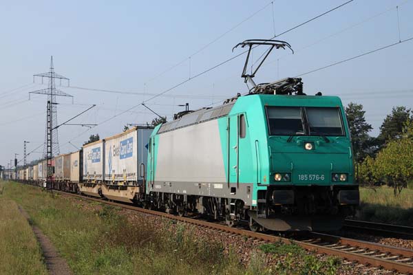Die Alpha Trains Loks 185 576 und 185 577 sind seit August nicht mehr an LTE sondern an Crossrail vermietet. Am 14. August war 185 576-6 mit dem EWALS-KLV-Zug bei Wiesental zu sehen.