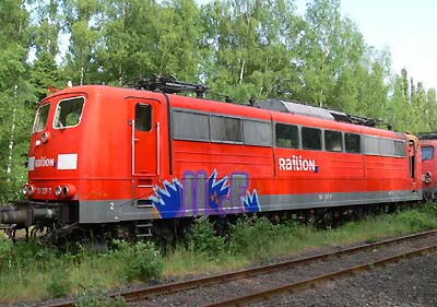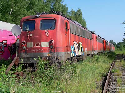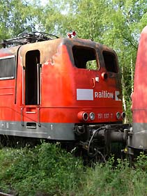 Bender, Opladen 19.05.2008![]() ![]() ![]() ![]() Die Verschrottungskandidaten 140 504, 140 349, 151 137, 140 044 und 140 640 stehen seit Freitag vor den Bender-Toren in Opladen auf einem Nebengleis. Das eigentliche BENDER-Anschlußgleis war durch einen Trafotransport belegt. Mitten im Grünen: 140 504, 140 349, 151 137, 140 044 und 140 640. Die Plattlinger Unfall-Lok 140 640 an ihrer letzten Station - die Schüssel gehört allerdings zum benachbarten Werkstattwagen. Die im Führerstand 1 komplett ausgebrannte 151 137. Der Haupttransformator ist bereits ausgebaut. Quelle:/Fotos: Markus Tigges | |