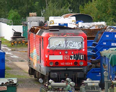 Letzte Aufnahme vom 16.08.2007 der ausgebrannten 143 603, bevor diese bei der Recyclingfa. Bender in Opladen zerlegt wurde.