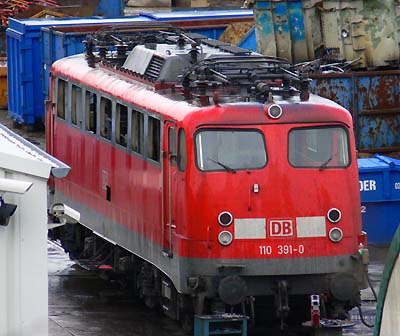 Die ehemalige Dortmunder 110 391-0 (z 05.12.2006) steht am 13.02.2007 einsam aber gut bewacht auf dem Bender-Gelände in Opladen und wartet auf den Vollstrecker.