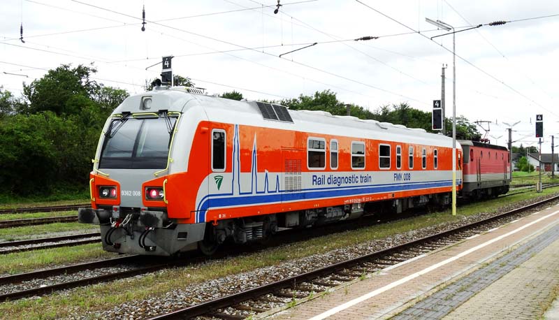 Der neue ungarische UltraschallprüfwagenSeit einigen Monaten gibt es einen neuen ungarischen Ultraschallprüfwagen, welcher nun auch in Österreich zum Einsatz kam. Dabei handelt es sich um den im Jahr 2015 gebauten Messwagen FMK 008 mit der intern. Wagennummer H-KFV 9955 9362 008-2. In der Kalenderwoche 32 waren auch Messungen im österreichischen Streckennetz anberaumt, wobei dieser 'Neuling' im Schlepp der 1144.052 am 12.8.2016 in Gramatneusiedl gesehen werden konnte.
