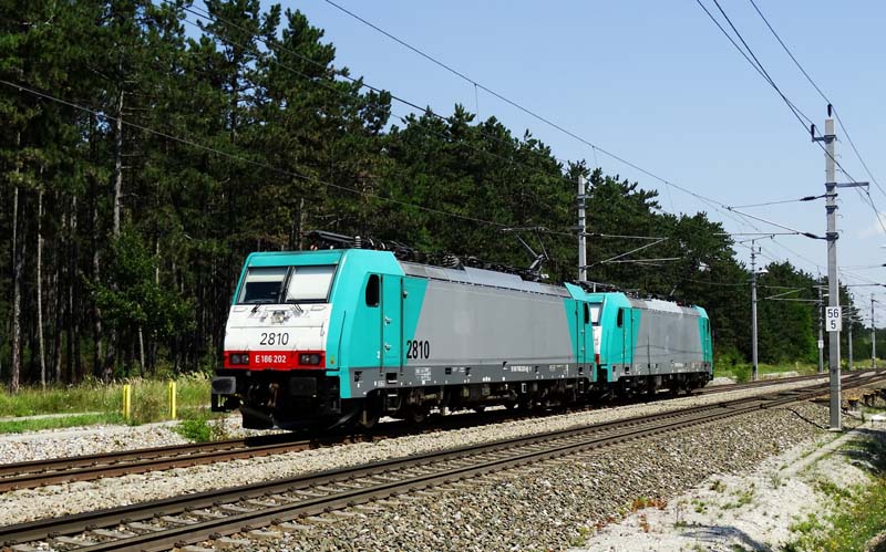 Stromabnehmermessfahrten in ÖsterreichAktuell gibt es wieder einmal Stromabnehmermessfahrten in Österreich, wobei der Abschnitt zwischen Wr. Neustadt und Ternitz befahren wird. Diesmal sind es die 186 202 (ehemalige belgische 2810) und die 186 242 (ex ITL). Gefahren werden so etwa 8 Probezugpaare, wobei die Geschwindigkeiten variieren und die Stromabnehmerstellungen immer wieder dem Messprogramm angepasst werden. Das Bild zeigt die 186 202 und 186 242 mit Probezug am 18.8.2016 bei St. Egyden.