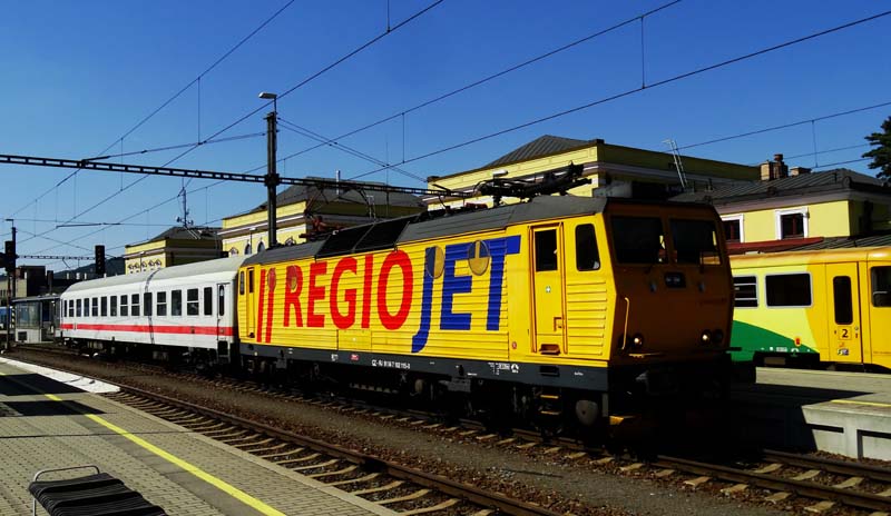 RegioJet-162 am Arriva-ZugWie ja bekannt ist betreibt das EVU ARRIVA den Personenverkehr zwischen den tschechischen Bahnhöfen Sumperk und Kouty nad Desnou. Neben den Dieseltriebwagen kommt seit geraumer Zeit auch die RegioJet-Lok 162.114 im ARRIVA-Design bei einigen Zugpaaren zum Einsatz. Diese Lok war ja ursprünglich beim EVU FNM als E630-04 im Einsatz. Nicht aber am 1.9.2016, denn da wurde die gelbe RJ-Lok 162.115 samt dem Reisezugwagen D-DB 5180 8490 032-4 Bimdz gesehen.Das Bild zeigt RJ 162.115 mit Os 13768 am 1.9.2016 in Sumperk.