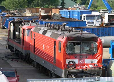 Die Unfall-Lok 143 607 aus Bochum und die 110 379 beim Bender in Opladen am 15. August 2006.