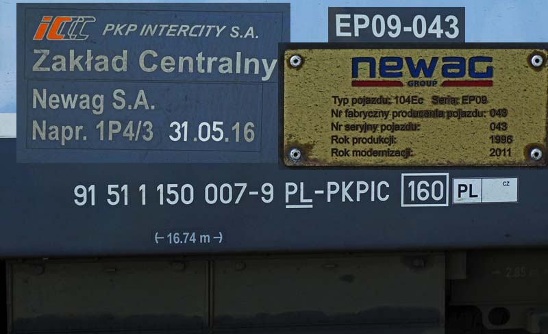 EP09-043 91 51 1 150 007-9 PL-PKPIC UIC: PL-CZ Zaklad Centralny Newag S.A. 104 Ec - 043 - 1996 - 2011 Napr. 1p4/3 31.05.16 (aufgenommen am 18.11.2016) Quelle:/Fotos: Herbert Pschill | |
