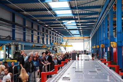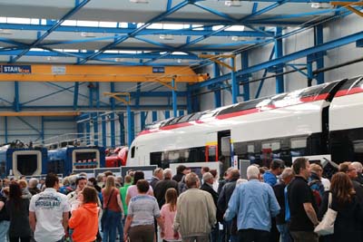 40'000 Besucher am Tag der offenen Tür von StadlerStadler feiert dieses Jahr sein 75-Jahr-Jubiläum und hat deshalb am 20. Mai 2017 an den Standorten in Bussnang, Altenrhein und Winterthur seine Türen geöffnet. Insgesamt besuchten rund 40'000 Personen die drei Stadler-Werke. Alleine in Bussnang wurden rund 28'000 Besucherinnen und Besucher gezählt. Auf sehr grosses Interesse stiess der neue Gotthard-Zug der SBB, welcher in Bussnang besichtigt werden konnte.![]() ![]() Stadler hat am 20. Mai 2017 an den Produktionsstandorten Bussnang (TG), Altenrhein (SG) und Winterthur (ZH) für die Öffentlichkeit die Tore geöffnet. Die drei Werke konnten besichtigt werden. Auf einem Rundgang liess sich nachverfolgen, wie ein Zug entsteht. Auf grossen Anklang stiessen die ausgestellten Fahrzeuge, die auch von Innen besichtigt werden konnten. Highlight war der neue Gotthard-Zug der SBB, welcher nach dem Roll-out vom 18. Mai nun für die ganze Bevölkerung in Bussnang zur Besichtigung offen stand. Rege genutzt wurde auch der Fahrsimulator, in welchem die Gotthard-Strecke als „Lokführer“ abgefahren werden konnte. In Altenrhein konnten sich die Gäste überdies näher mit KISS-Doppelstockzügen und Strassenbahnen vertraut machen und in Winterthur standen die Drehgestelle im Zentrum des Interesses. Grossen Andrang erfuhren die Talkrunden, welche an jedem Standort mit Peter Spuhler, Group CEO und Eigentümer von Stadler, dem jeweiligen Standortleiter und Viktor Giacobbo als Moderator durchgeführt wurden. Stadler-Mitarbeiter empfingen die Gäste, führten sie durch den Rundgang, erzählten an diversen Posten Wissenswertes zu den Fahrzeugen und beantworteten die Fragen der Besucherinnen und Besucher. Auch an den Grill-Stationen und im Getränke-Ausschank standen Stadler-Mitarbeiter. Auf diese Art bedankt sich das Unternehmen für das grosse Wohlwollen in der Bevölkerung, das ihm das ganze Jahr über entgegengebracht wird. Auf den drei Festplätzen wurden in der Zeit von 10 Uhr bis 16 Uhr nachmittags über 35'000 Würste, 6'000 Liter Bier und 7'800 Liter Softdrinks verteilt und konsumiert. Quelle:/Fotos: Stadler Rail Group | |