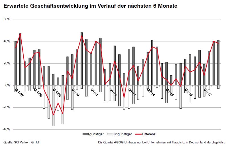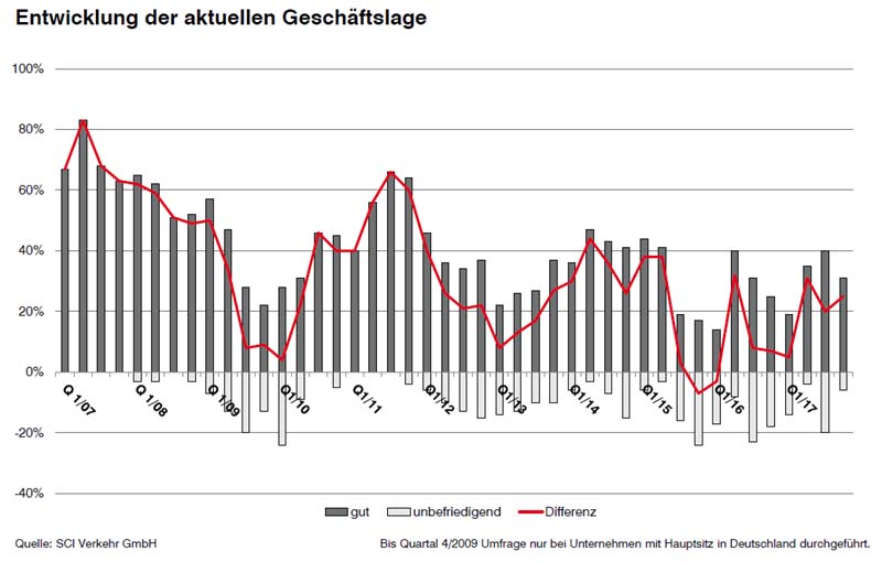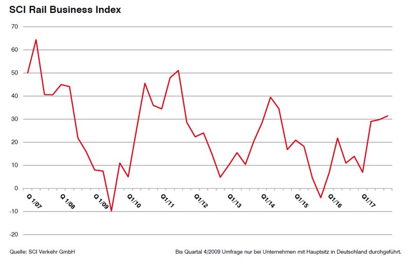 SCI Global Rail Index 4/2017: Globale Bahnwirtschaft blickt sehr optimistisch in die ZukunftDas Geschäftsklima unter den führenden Unternehmen in der globalen Bahnindustrie legt auch im vierten Quartal 2017 weiter zu. Das zeigt der aktuelle SCI RAIL BUSINESS INDEX – eine regelmäßige Befragung der Top-Manager der weltweiten Bahnbranche durch das Beratungsunternehmen SCI Verkehr. Die Bewertung der aktuellen Geschäftslage entwickelt sich auch im letzten Quartal des Jahres weiter positiv. Die anhaltend starke Nachfrage nach Produkten und Leistungen sowie die Ausweitung der Digitalisierung in der Bahnbranche führen zu dem aktuellen Wachstumstrend.