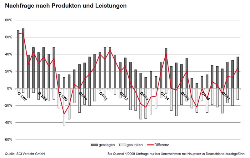 Die Nachfrage nach Produkten und Dienstleitungen, als wichtiger Indikator für die Branchenentwicklung, ist im Vergleich zum vorherigen Quartal wieder auf deutlichem Wachstumskurs. Insgesamt berichten 37% der befragten Top-Manager von einer postiven Entwicklung. Dieser Einschätzung stehen nur 13% der befragten Top-Manager mit einer negativen Einschätzung entgegen, was dem niedrigsten Wert seit dreieinhalb Jahren entspricht. Diese Entwicklung spiegelt sich auch in der Aussage zu den aktuellen Auftragsbeständen wider. Der Anteil an Unternehmen, die Ihren Auftragsbestande als „zu klein“ angeben, ist im Jahr 2017 in der Summe so niedrig wie seit dem Jahr 2011 nicht mehr.