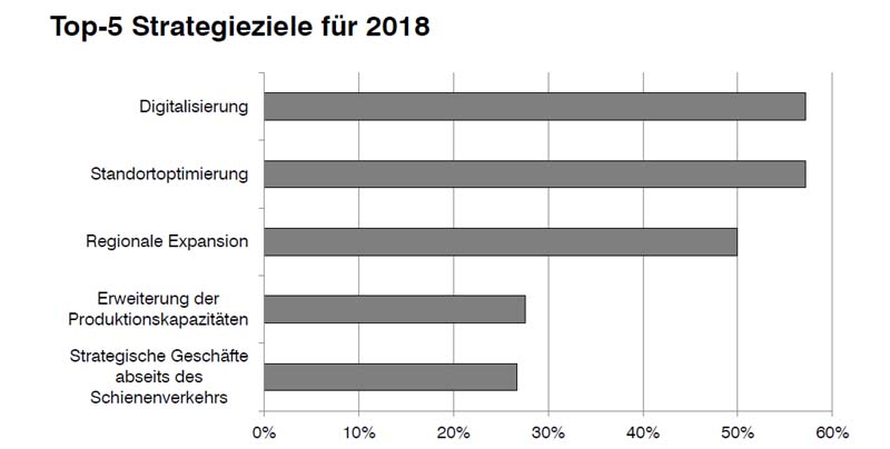 Im Rahmen der SCI Global Rail Index 4/2017 Umfrage wurden die Top-Manager zu den Zielen für das kommende Jahr 2018 befragt. Die Themen Digitalisierung und Standortoptimierung wurden von 57% der befragten Top-Manager als wichtige strategische Ziele für 2018 ausgewiesen. Die regionale Expansion der Geschäftsfelder kann als weiteres relevantes Thema für 2018 angesehen werden. Weitere Themen von Bedeutung sind die Erweiterung der Produktionskapazitäten und die strategische Ausweitung von Geschäften abseits des Schienenverkehrs.