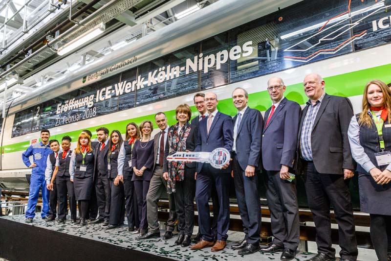 Mit einer symbolischen Schlüsselübergabe wurde am 23. Februar 2018 das komplett CO2-neutrale ICE-Instandhaltungswerk in Köln-Nippes feierlich in Betrieb genommen. Berthold Huber, Vorstand Personenverkehr der Deutschen Bahn, eröffnete mit Hendrik Wüst, Verkehrsminister des Landes NRW, sowie Henriette Reker, Oberbürgermeisterin der Stadt Köln, und zahlreichen Vertretern von Bahn und Politik das 23 Hektar große Werk. Dies entspricht mehr als 32 Fußballfeldern. Gleichzeitig wurde der erste ICE in Europas modernsten und umweltfreundlichsten ICE-Werk der Deutschen Bahn (DB) begrüßt dem Anlass entsprechend mit grünem statt mit rotem Seitenstreifen. „Mit dem ersten CO2-neutralen ICE-Werk in Köln-Nippes stärkt die Deutsche Bahn ihre Vorreiterrolle im Klimaschutz. Zudem reisen unsere Fernverkehrskunden seit Januar mit 100 Prozent Ökostrom, sagt Berthold Huber, Vorstand Personenverkehr der Deutschen Bahn. „Reisende profitieren so doppelt: Bahnfahren ist jetzt nicht nur noch umweltfreundlicher, sondern mit der Vervierfachung unserer Wartungskapazitäten in Köln steigern wir auch den Komfort und die Verlässlichkeit unserer ICE-Züge. Außerdem schaffen wir hier 400 neue Arbeitsplätze.“ „Die Deutsche Bahn schafft hier viele neue und gute Arbeitsplätze. Mit dem massiven Ausbau der Instandhaltungskapazitäten wird einer der wichtigsten Eisenbahnknoten in unserem Land gestärkt - und damit auch der Fernverkehr in Nordrhein-Westfalen. Das neue umweltbewusste ICE-Werk ist ein starkes Zeichen für die Mobilität der Zukunft in unserem Land. Leistungsfähiger, öffentlicher Verkehr bleibt wichtige Grundlage unserer Mobilität. Auch deshalb passt dieses Werk gut zu Nordrhein-Westfalen – dem Industrie- und Energieland Nr. 1 in Deutschland“, so Armin Laschet, Ministerpräsident des Landes Nordrhein-Westfalen. „Ich freue mich, dass in Köln nunmehr das modernste ICE-Instandsetzungswerk Europas steht und gratuliere den Bauherren. Die Deutsche Bahn unterstreicht mit Ihrer Entscheidung für Köln die Bedeutung unserer Stadt als europäischen Verkehrsknotenpunkt. Wir führen seit vielen Jahren einen engen Dialog bei der umweltgerechten Verkehrsgestaltung. Ich freue mich daher darauf, gemeinsam weitere Großprojekte wie etwa die Kölner Fernbahnhöfe oder den Stammstreckenausbau anzugehen. Gerade der Bahn kommt eine entscheidende Rolle bei der Bewältigung der schwierigen Aufgabe zu, eine umweltgerechte Mobilität für Personen aber auch Güter auszubauen “, sagt Henriette Reker. So funktioniert das grüne ICE-Werk Die DB hat in das grüne ICE-Werk rund 220 Millionen Euro investiert. Verbaut wurden vornehmlich regionale Baustoffe. Im laufenden Betrieb ist das grüne Werk CO2-neutral und spart jährlich somit 1.000 Tonnen Kohlendioxid ein. Alle ICE-Baureihen, auch der ICE 4, werden demnächst hier gewartet. Mit der Inbetriebnahme des neuen Werkes in Köln-Nippes werden Instandhaltungskapazitäten am Standort Köln vervierfacht. Bundesweit steigt die Kapazität um 12 Prozent. Das sorgt für noch mehr Qualität und Zuverlässigkeit im Fernverkehr. Für den Ausbau der Kapazitäten sucht die DB derzeit noch Mitarbeiter, insbesondere Handwerker (vor allem Mechatroniker und Elektroniker), Lokführer, Fachkräfte für Lagerlogistik oder Materialwirtschaft sowie Meister und Ingenieure Es wurden bereits 170 Mitarbeiter neu eingestellt, in den nächsten Jahren werden hier insgesamt 400 neue Arbeitsplätze entstehen. Um das Werk CO2-neutral zu betreiben, setzt die DB auf Wärme aus Geothermie (Erdwärme) und Strom aus Sonnenenergie; die Klimatisierung des Gebäudes erfolgt durch die geothermische Nutzung des 12,5 Grad Celsius warmen Grundwassers. Im Sommer kühlt das Wasser die Halle sowie die angrenzenden Gebäude. Im Winter heben drei Wärmepumpen die Grundwassertemperatur auf ein angenehmes Temperaturniveau, um die Gebäude zu heizen. Zusätzlich wurde eine rund 2.100 Quadratmeter große Photovoltaikanlage mit einer installierten Leistung von 300 Kilowattstunden (KWh) gebaut, die den Strombedarf der Wärmepumpen deckt. Auf die Nutzung von fossilen Brennstoffen wird im neuen Werk gänzlich verzichtet. Um die Lärmbelastung für Anwohner zu reduzieren, hat die DB sogenannte Flüsterschienen verlegt, auf denen Züge leiser fahren. Die Deutsche Bahn will Umwelt-Vorreiter werden. Bis 2030 werden die spezifischen CO2-Emissionen im Vergleich zu 2006 um 50 Prozent gesenkt. Zusätzlich will sie den derzeitigen Ökostromanteil im gesamten DB-Bahnstrommix von 42 auf 70 Prozent steigern. Bis 2050 soll der Zugverkehr emissionsfrei sein. Zukunft Bahn Mit dem 2016 gestarteten Qualitätsprogramm „Zukunft Bahn wird die DB Qualität, Pünktlichkeit und Kundenorientierung nachhaltig verbessern. Ihre Kunden will die DB mit Sauberkeit und Komfort in den Bahnhöfen, pünktlicheren Zügen, zuverlässiger Kundeninformation und komfortablen Fahrzeugen als sympathischer Dienstleister überzeugen. Strategisches Ziel des mehrjährigen Programms ist es, über eine bessere Qualität der Kundenangebote den wirtschaftlichen Erfolg zu steigern.