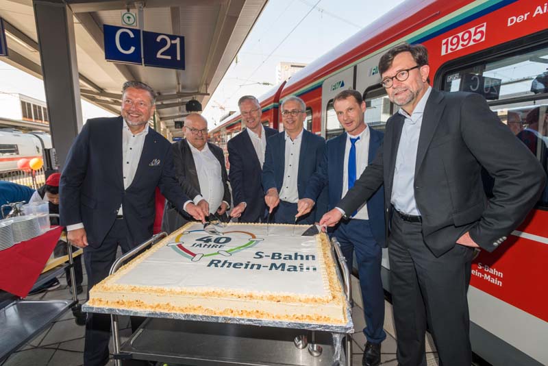 Die S-Bahn Rhein-Main feiert Geburtstag: Vor 40 Jahren, am 28. Mai 1978, rollte die erste S-Bahn von der Frankfurter Galluswarte über den Hauptbahnhof bis zur Hauptwache. Nach 16 Jahren Planung und Bauzeit fiel damals der Startschuss für die neue Stadtschnellbahn, die bald für Millionen von Menschen im Rhein-Main-Gebiet zum Alltag gehören sollte. Gemeinsam mit der Region ist die S-Bahn seitdem stetig gewachsen. Zum Beispiel 1983, als der City-Tunnel von der Hauptwache bis zur Konstablerwache verlängert, oder 1990 als die S-Bahn unter dem Main hin-durch bis nach Sachsenhausen und Frankfurt Süd ausgebaut wurde. Heute ist das Streckennetz der S-Bahn Rhein-Main über 300 Kilometer lang. Ihre Züge legen darauf jeden Tag 44.000 Kilometer zurück – das ist mehr als eine Erdumrundung. Beeindruckend ist aber vor allem die Zahl der Fahrgäste: Jeden Tage fahren eine halbe Million Menschen mit der S-Bahn Rhein-Main. S-Bahn-Chef Christian Roth spricht daher beim Geburtstagsempfang am Frankfurter Hauptbahnhof auch vom der S-Bahn als Rückgrat des öffentlichen Nahverkehrs im Rhein-Main Gebiet: „Die S-Bahn ist aus dem Leben vieler Menschen nicht wegzudenken. Auch wenn nicht immer alles rund läuft. Wir strengen uns jeden Tag an, um die S-Bahn pünktlicher zu machen und wir sind 365 Tage im Jahr rund um die Uhr für unsere Fahrgäste da. Zum Geburtstag der S-Bahn danke ich vor allem meinen Kolleginnen und Kolleginnen, die dies für die Menschen in unserer Region überhaupt erst möglich machen.“ Ähnlich äußerte sich auch der hessische Wirtschafts- und Verkehrsminister, Tarek Al-Wazir, der ebenfalls unter den Geburtstagsgästen war. „Wie erfolgreich das Modell S-Bahn ist, sieht man an den immer weiter steigenden Fahrgastzahlen. Damit die S-Bahn ein Erfolgsmodell bleibt, müssen wir jetzt die Weichen für weitere Investitionen stellen. Genau das machen wir beispielsweise mit dem viergleisigen Ausbau für die S6, dem neuen Haltepunkt Gateway Gardens oder dem neuen elektronischen Stellwerk im Frankfurter S-Bahn-Tunnel. Die Menschen erwarten von uns zu Recht, dass wir das An-gebot weiter ausbauen und verbessern. Mit dem Programm Frankfurt Rhein-Main plus und den Vorhaben des Bundesverkehrswegeplans 2030 für mehr Investitionen in das hessische Schienennetz sind wir auf dem richtigen Weg.“ „Dass eine halbe Million Fahrgäste pro Tag die S-Bahn nutzen, macht uns stolz“, sagt Prof. Knut Ringat, Geschäftsführer und Sprecher der Geschäftsführung des RMV. Gleichzeitig wollen wir in Sachen Qualität und Pünktlichkeit noch deutlich besser werden. Wir schauen daher heute zum Geburtstag der S-Bahn weniger zurück, sondern vielmehr nach vorne. Uns geht es darum, die S-Bahn für unsere Fahrgäste auch nach 40 Jahren immer noch attraktiver zu machen, wie zum Beispiel mit dem Nachtverkehr, den wir letzten Dezember eingeführt haben oder durch unsere Investition in kostenloses WLAN in allen S-Bahn-Zügen, die wir vor kurzem besiegelt haben.“ Dass die S-Bahn nicht nur für das Rhein-Main-Gebiet, sondern auch für die Deutsche Bahn von wesentlicher Bedeutung ist, betonte DB Regio-Chef Dr. Jörg Sandvoß. „Die S-Bahn Rhein-Main ist nach Berlin und München die drittgrößte S-Bahn Deutschlands. Unsere fünf größten S-Bahnen haben zu-sammen die Hälfte aller täglichen Reisenden der Deutschen Bahn. Jeder zweite Bahnkunde ist S-Bahn-Fahrgast. Daran können Sie erkennen, wie wichtig uns unsere S-Bahnen sind“, sagte der Bahn-Manager in seinem Geburtstagsgruß. Während Mitarbeiter von DB und RMV am Nachmittag kleine Geburtstagskuchen an die Fahrgäste verteilten, schnitten die Redner am Bahnhof gemein-sam eine große Geburtstagstorte für die S-Bahn an. Kulisse hierfür bildete eine von fünf frisch beklebten Jubiläums-S-Bahnen. Die mit wesentlichen Daten und Fakten aus den letzten vier Jahrzehnten S-Bahn-Geschichte versehenen Züge sollen noch bis mindestens Ende des Jahres im gesamten Streckennetz unterwegs sein. Meilensteine: 40 Jahre S-Bahn Rhein-Main 28.05.1978: Startschuss - Inbetriebnahme der S-Bahn Rhein-Main Die S-Bahn besteht aus sechs Linien, die von Wiesbaden (S1), Niedernhausen (S2), Bad Soden (S3), Kronberg (S4), Friedrichsdorf (S5) und Friedberg (S6) in die Frankfurter City führen. Der 2,6 Kilometer lange S-Bahn-Tunnel endete zu dieser Zeit noch an der Hauptwache. Die Bauarbeiten für den Tunnel hatten 1969 begonnen. 1980: Schneller zum Flieger - Anbindung des Frankfurter Flughafens an das S-Bahn Netz 1983: Tunnel verlängert - Inbetriebnahme des neuen Zeiltunnels mit der Station Konstablerwache, die gleichzeitig S- und U-Bahn-Halt ist 1990: S-Bahn unterm Main - Verlängerung der S-Bahn bis Frankfurt Süd Sachsenhausen ist am Netz: Die S-Bahn fährt von nun an von Frankfurt Hauptwache über Konstablerwache und Ostendstraße unter dem Main hindurch nach Sachsenhausen, wo sie am Lokalbahnhof, der Stresemannallee und in Frankfurt Süd Station macht. 1992: Mehr Sachsenhausen - Eröffnung der S-Bahn-Station Mühlberg 1995: Schneller Richtung Osten - Eröffnung der Strecke zwischen Offenbach-Ost und Hanau 1997: Bessere Verbindung nach Südhessen - Verlängerung der Linien S3 nach Darmstadt und der Linie S4 nach Langen 1998: Auf zur Messe - Eröffnung der S-Bahn-Station Messe Frankfurt 2002: Moderne Züge - Neue Fahrzeuge für die S-Bahn Rhein-Main Seit dem Start der S-Bahn Rhein-Main war ihr Bild durch die S-Bahn-Fahrzeuge der Baureihe ET 420 geprägt. Nun kommt die nächste Generation von Triebzügen der Baureihe ET 423 zum Einsatz. Sichtbarste Veränderung: Alle Wagenteile sind miteinander verbunden. Durch die komplette Durchgängigkeit wirken die neuen Wagen moderner und übersichtlicherer als ihre Vorgänger. 2003: Noch besser in den Landkreis Offenbach - Ausbau der S1 bis Rödermark Oberroden und der S2 bis Dietzenbach 2006: Fahrzeuge in Topform: Inbetriebnahme der neuen S-Bahn-Werkstatt In der ehemaligen Posthalle am Frankfurt Hauptbahnhof ist die neue S-Bahn-Werkstatt eingez