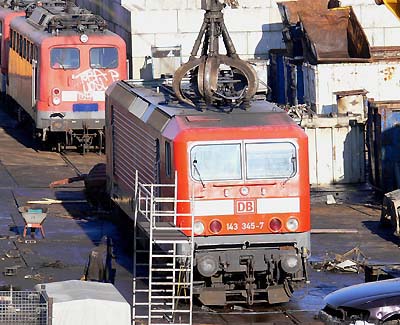 Bender-Update, 31.01.2011 Die 143 345 wurde am Freitag gegen Mittag vom Stutzen weggezogen und es wurde dann umgehend mit der Zerlegung begonnen. Der Lokrahmen ist heute dran, somit: 143 345 ++ 31.01.2011Es folgt dann 140 594 (mit übermalter Nummer). Die Neuzugänge aus Rostock waren Freitag noch im Bf Opladen abgestellt. Quelle:/Fotos: Markus Tigges | |
