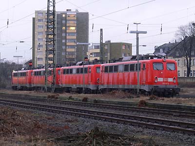 Bender/Opladen-Update, 11.2.2011 Die 139 137 (vorn) + 139 250 + 139 165 + 139 559 wurden am 10.02.2011 in der Reihung nach Opladen zur Überstellung zum nahegelegenen Bender gebracht. Am verregneten Morgen des 11.02.2011 warten die vier „Altbau-Eloks“ im Bf auf ihr sicheres Ende.