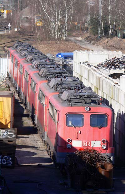 Bender-Update, 06.03.2011 Trotz reger Versuche in Opladen zur Unkenntlichmachung der Verschrottungskandidaten kann festgehalten werden: 140 586 ++ 03.03.2011 140 691 ++ 04.03.2011 Am Wochenende stand 140 752 als nächste an (zufällig von einem Haufen Altmetall verdeckt, zusätzlich zu der bereits übermalten Nummer) und 140 767 leistet weiterhin vorn im Stutzen ihren Dienst als „Sichtschutz-Lok“ Quelle:/Fotos: Markus Tigges | |