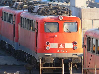 Bender-Update, 21.03.2011![]() ![]() Es gibt einen Neuzugang in Opladen: Die orientrote 155 093, die über 1 Jahr lang in Gremberg abgestellt war, wurde am 18.3.2011 aufs Bender-Gelände überstellt. Die Lok wurde bei einem Unfall (Flankenfahrt mit 294 643) am 15.12.09 in Stadtallendorf beschädigt und nicht wieder aufgearbeitet. Am Morgen des 21.03.2011 wird bei der 140 595 mit der Zelegung begonnen - dahinter 139 137.