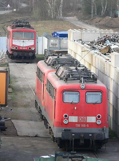 Bender-Update, 24.03.2011 Und leider wieder eine weniger: 139 250 ++ 24.03.2011 Das Restprogramm für die nächsten Tage bilden 139 165, 139 559 und 155 093: Nachschub ist bereits in Form eines neuen Schrottlokzuges heute Abend in Opladen eingetroffen. 143 022, 143 077, 143 252, 143 824, 143 826, 143 887 (alle aus Nürnberg) sowie 110 333 (am Zugschluss) aus München. Als Zuglok fungierte 143 253. Quelle:/Fotos: Markus Tigges | |
