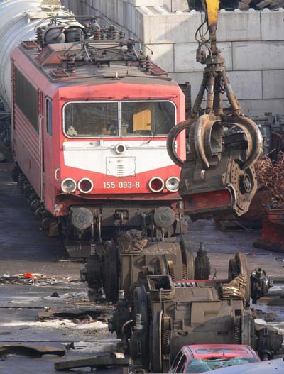 Bender-Update, 30.03.2011![]() ![]() Nun sind die 139er beim Bender komplett zerlegt:139 559 ++ 29.03.2011 139 165 ++ 30.03.2011 155 093 steht am Morgen des 30.03.2011 als nächste an, davor werden die Drehgestell-/Fahrmotor-Reste der 139 165 beseitigt. Die 6 x 143er + 110 333 wurden am 29.03.2011 auf das Bender-Gelände überstellt. Für 143 077 war kein Platz auf dem umzäunten Firmengelände – sie steht auf dem Anschlußgleis. Auf dem Zugzielanzeiger ist noch „Bad Doberan“ zu lesen – wahrscheinlich war das ihre letzte Fahrt. Interessanterweise sind die beiden Kesselwagen jetzt zwischen den Loks eingekeilt – nicht, daß diese doch noch verschrottet werden ... Quelle:/Fotos: Markus Tigges | |