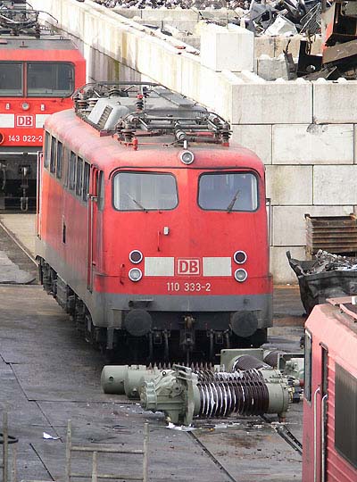Bender-Update, 01.04.2011 Wie bereits berichtet wurden die beiden Kesselwagen tatsächlich in Opladen verschrottet. Das muß kein Novum beim Bender sein, konnte aber zumindest über die letzten 6-7 Jahre nicht beobachtet werden. Die ehemalige Münchner 110 333-2 steht als nächste zur Zerlegung an - an der Seite wurde bereits das Loch zum Ablassen der Betriebsstoffe reingeschnitten. Dahinter steht 143 022 an und vorn am Stutzen der Sechsachser in Form von 155 093.