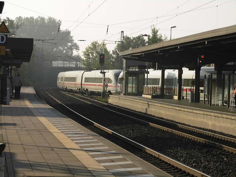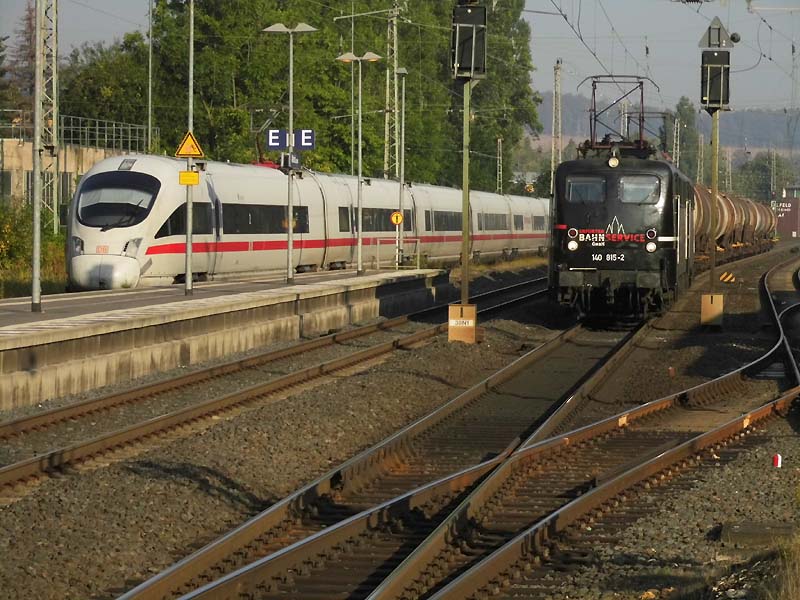 Extraordinäre Überholung mit einem Gleis „Sicherheitsabstand“: eine ICE3-Doppelgarnitur überholt die beiden E40 mit ihrem Zug und fädelt sich dann wieder ins Hauptgleis..