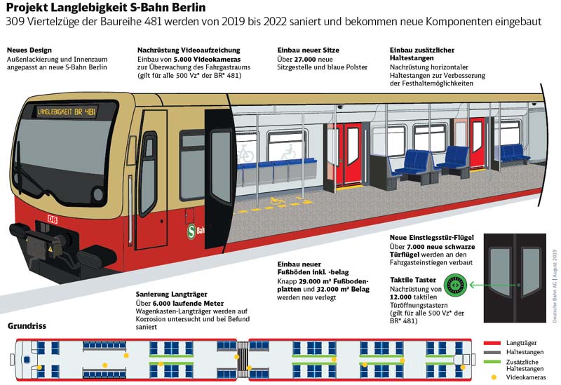 Es ist ein Megaprojekt der S-Bahn Berlin: „Langlebigkeit BR 481“. Die Fahrzeuge der Baureihe aus den Jahren 1997 bis 2004 werden komplett saniert und umgestaltet. Nun ist der vorerst wichtigste Meilenstein erreicht: Das erste Fahrzeug ist fertig und wurde heute im Werk Schöneweide der Öffentlichkeit präsentiert durch S-Bahnchef Peter Buchner, Verkehrssenatorin Regine Günther, Ines Jesse, Staatssekretärin für Infrastruktur des Landes Brandenburg, VBB-Chefin Susanne Henckel und Alexander Kaczmarek, DB-Konzernbevollmächtigter für Berlin. Gleich im Anschluss ging es auf Jungfernfahrt in den regulären Fahrgastbetrieb auf der Linie S47. Die modernisierten Fahrzeuge sehen der neuen S-Bahn, die ab 2021 zum Einsatz kommt, zum Verwechseln ähnlich: Lackierung, Sitze und Polster, die Fußböden erscheinen im selben Design. Doch nicht nur das Aussehen ändert sich – auch für einen zuverlässigen Weiterbetrieb wird vieles neu gemacht. Ein paar Details: Regine Günther, Senatorin für Umwelt, Verkehr und Klimaschutz: „Ich freue mich sehr, dass wir mit der S-Bahn Berlin GmbH zu einer verlässlichen Vereinbarung gekommen sind und den Fahrgästen in den kommenden Jahren ein attraktives und stabiles Angebot machen können: Frisch renovierte, technisch verbesserte und mit deutlich mehr Barrierefreiheit ausgestattete Züge der Baureihe 481/482 werden ab sofort über die nächsten Jahre auf Berlins S-Bahn-Gleisen rollen. So können die Menschen bequemer und sicherer den ÖPNV nutzen und leisten damit auch einen Beitrag zum Klimaschutz.' Ines Jesse, Staatssekretärin für Infrastruktur und Landesplanung des Landes Brandenburg: „Die S-Bahn gehört zu den wichtigsten Verkehrsmitteln für die Pendlerinnen und Pendler im Land. Wer täglich mit den Zügen unterwegs ist, erwartet neben Pünktlichkeit auch Zuverlässigkeit, Sicherheit und Komfort. Das wird mit dem „Projekt Langlebigkeit der Baureihe 481“ erreicht. In die Züge wurden untern anderem zusätzliche Haltestangen und neue Sitze eingebaut. Mit neuen Türöffnern wurde der Ein- und Ausstieg für Menschen mit Sehbehinderungen verbessert. Von der technischen Erneuerung der Baureihe erhoffen wir uns einen reibungslosen S-Bahn Verkehr.“ Die S-Bahn selbst hat Geld und viel Manpower in das Projekt investiert: Etwa 360 Handwerker im Werk Schöneweide sind bis 2024 ein Drittel ihrer Zeit ausschließlich mit den Arbeiten für das Projekt Langlebigkeit beschäftigt. Rund 50.000 Engineering-Stunden wurden in das Projekt investiert. Für die Ausrüstung der Schleif- und Klebehalle im Werk Schöneweide wurden zwei Millionen Euro aufgebracht. Auch die Fahrzeugdisposition der S-Bahn Berlin stemmt während der Dauer des Projekts eine Herkules-Aufgabe, um einen stabilen Betrieb aufrecht zu erhalten. Denn 21 Viertelzüge stehen für die Langlebigkeit im eingeschwungenen Zustand gleichzeitig in Schöneweide – und das jeweils für eine geplante Durchlaufzeit von elf Wochen pro Zug. Peter Buchner, Vorsitzender der Geschäftsführung der S-Bahn Berlin: „Engineering und Umbau machen wir in Schöneweide selbst. Das ist eine große Herausforderung, schließlich dürfen im Betrieb keine Fahrzeuge fehlen. Ich bin stolz darauf, dass wir an diesem Standort mit unseren Mitarbeitern das Know-how und die Kapazitäten selbst haben.“ Susanne Henckel, Chefin des Verkehrsverbunds Berlin-Brandenburg: „Als VBB freuen wir uns natürlich besonders für alle Fahrgäste. Der komplett überarbeitete Innenraumbereich mit frischem Design, zusätzlichen Videokameras und mehr Barrierefreiheit verbessert die Qualität in allen Bereichen erheblich. Diese Fahrzeuge erhalten hier ein „zweites Leben“. Damit geben wir den Menschen wieder einen Grund mehr um auf die Bahn umzusteigen. Der Dank gilt all denjenigen, die die Langlebigkeit der Fahrzeuge sicherstellen.“