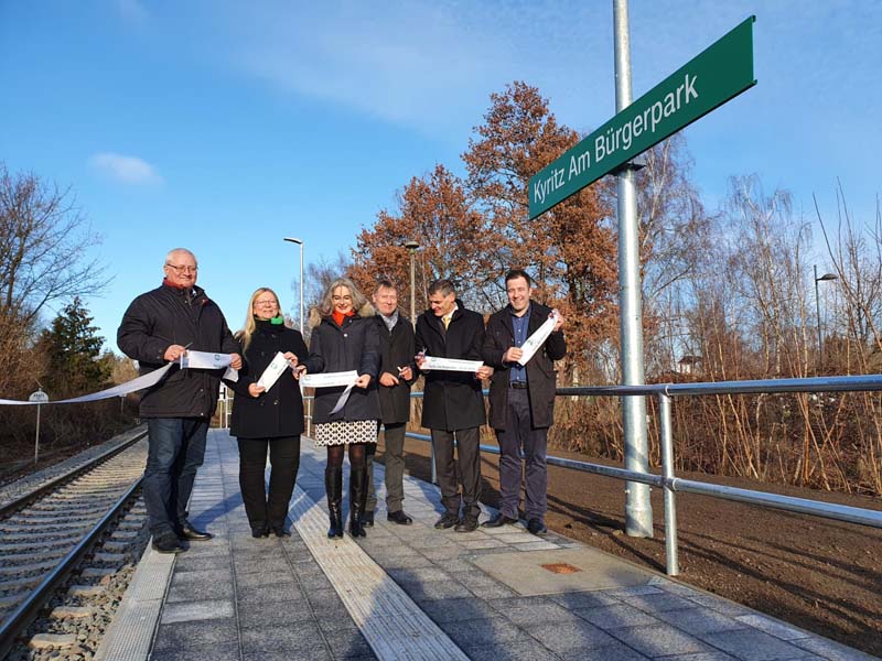 Somit konnte die Übergabe pünktlich zum Fahrplanwechsel erfolgen und der neue Bahnhaltepunkt zusätzlich zu dem bereits bestehenden Haltepunkt in den Fahrplan aufgenommen werden. Das Investitionsvolumen für diesen ersten Bauabschnitt eines umfassenden Modernisierung der Schieneninfrastruktur in der Prignitz liegt bei rund 300.000 Euro. Im Beisein von Susanne Henckel, Geschäftsführerin VBB Verkehrsverbund Berlin-Brandenburg GmbH sowie Nora Görke, Bürgermeisterin der Stadt Kyritz, freut sich Dr. Ralf Böhme, Geschäftsführer der HANSeatischen Eisenbahn GmbH und Vorstand der DESAG über den zusätzlichen Halt in Kyritz. „Mit dieser neuen Infrastruktur schaffen wir einen neuen Zugang zum Angebot der HANSeatischen Eisenbahn auf der RB 73 - eine wesentliche Basis für die Steigerung der Attraktivität des Schienenpersonennahverkehrs im ländlichen Raum.“, so Böhme. Besonders erfreut zeigte sich auch Nora Görke, Bürgermeisterin der Stadt Kyritz über den neuen Haltepunkt. Ich bin stolz und glücklich über die Realisierung des Haltepunktes, Am Bürgerpark. Der Verkehrsknoten ist damit komplett. Jetzt hoffen wir, dass er von allen Kyritzern gut angenommen wird. Der Neubau des Haltepunktes gehört zu einem umfassenden Investitionsvorhabens in die Schieneninfrastruktur auf der RB 73 / 74, welches von der öffentlichen Hand, auch und im wesentlichen Teil durch das Land Brandenburg, gefördert voraussichtlich 2021 abgeschlossen sein wird. Der nächste Bauabschnitt umfasst die Modernisierung des benachbarten Bahnübergangs an der Perleberger Straße.