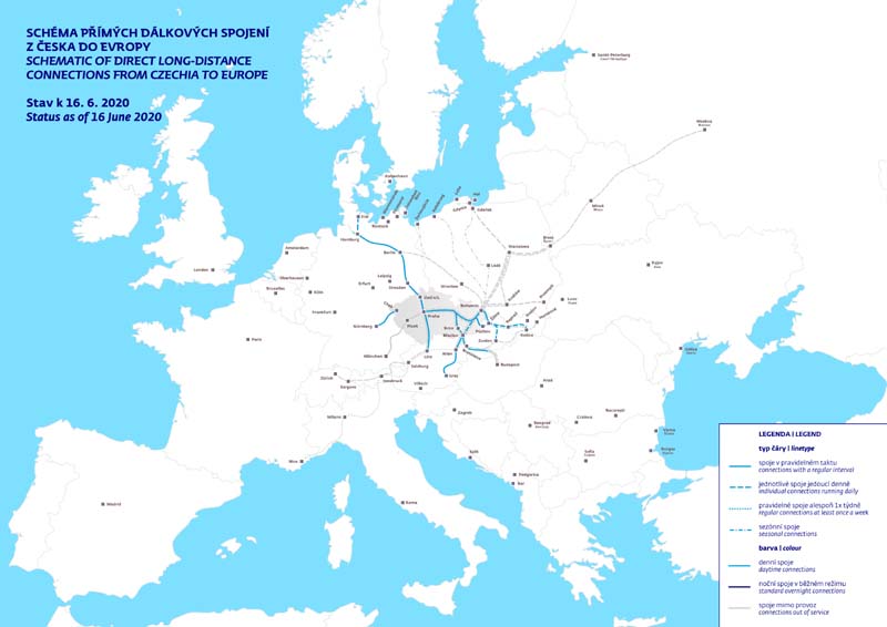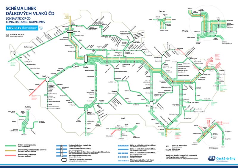 Die zusätzlichen Coronavirus-Verkehrsbeschränkungen enden vom Sonntag, 14. Juni bis Dienstag, 16. Juni. Die Railjet-Züge nach Wien und Graz kehren zurück und die Anzahl der Berliner Verbindungen nach Deutschland wird erweitert. Grenzüberschreitende Personenzüge nach Deutschland oder Österreich werden ebenfalls reativiert. Die SC Pendolino-Verbindungen zwischen Prag und Ostrava, der verbleibende Southern Express nach Ceske Budejovice und Linz wird ebenfalls zum normalen Fahrplan zurückkehren, und die Western Express-Züge zwischen Prag und Pilsen werden ebenfalls hinzugefügt. 'In Absprache mit Kunden und ausländischen Partnern werden wir den Betrieb anderer zwischenstaatlicher Züge vom Sonntag, 14. Juni, bis Dienstag, 16. Juni, schrittweise wieder aufnehmen. Ab dem 14. Juni kehren wir für zu einem vollständigen Fahrplan nach Deutschland mit den Berliner Zügen zurück, einschließlich der geplanten Ziele in Hamburg und Kiel. Ab Montag, dem 15. Juni, werden wir den zwischenstaatlichen Transport mit Railjet Vindobona und dem Southern Express nach Wien, Graz und Linz wieder vollständig aufnehmen. Am selben Tag erneuern wir auch die regionalen grenzüberschreitenden Verbindungen nach Deutschland und Österreich. Wir werden wieder schnelle und komfortable Reisen ins Ausland anbieten. Zum Beispiel dauert die Fahrt nach Wien oder Berlin ungefähr 4 Stunden, die Züge fahren alle zwei Stunden und die Fahrgäste haben Zugang zu WLAN in Zügen, einem Restaurantwagen, besonderen Orten für Reisen mit Kindern oder zum Transport von Fahrrädern. Die Beschränkungen gelten vorerst weiter hauptsächlich für Nachtzüge und für mehrere andere Verbindungen, deren Betrieb durch Schließungen oder die Schließung anderer Länder auf der Bahnstrecke beeinträchtigt wird. Ihr Betrieb wird voraussichtlich nach der Öffnung der Grenzen dieser Staaten, voraussichtlich Ende Juni, wieder aufgenommen. Bis zum 11. Juli ist der Betrieb der Strecke Prag - München aufgrund der Sperrung und Reparatur der Strecke zwischen Pilsen und Domažlice sowie auf deutscher Seite auch auf den Abschnitt Prag - Pilsen beschränkt. Ab dem 15. Juni wird die Tschechische Eisenbahn in Zusammenarbeit mit ausländischen Partnern auch den Betrieb fast aller grenzüberschreitenden Personenzüge an der tschechisch-deutschen und tschechisch-österreichischen Grenze wieder aufnehmen. Ausnahmen werden wiederum durch Schließungen und Gleisreparaturen verursacht. Einige Tage später werden beispielsweise Regionalzüge zwischen Potucky und Johanngeorgenstadt starten. Im zwischenstaatlichen Verkehr bestehen weiterhin Verkehrsbeschränkungen, insbesondere nach Polen und Ungarn, wo die Wiederaufnahme der zwischenstaatlichen Züge bisher Beschränkungen durch diese Staaten verhindert hat. Die Züge der Metropole Prag - Budapest fahren daher nur von / nach Nove Zamky, und die Züge von Prag nach Polen enden und starten in Bohumín. Der Zug 'Bathory' Warschau - Budapest verkehrt vorübergehend nur zwischen Bohumín und Nove Zamky und die Ungarnverbindung nur zwischen Prag und Nove Zámky. Anstelle der ungarischen Züge werden Ersatzzüge der Tschechischen Eisenbahn eingesetzt. Später wird auch der Railjet Metropolitan Slovenska Strela-Zug zwischen Prag und Bratislava erneuert (bis Ende Juni wird er nur im Abschnitt Prag - Breclav verkehren). Für die Strecke Österreich - Tschechische Republik - Polen wird ab dem 15. Juni nur die vom Österreichischen Zug im Abschnitt Graz - Wien - Bohumín betriebene Verbindung Porta Moravica EC 104/105 eingeführt. Weitere Verbindungen bestehen aufgrund der Schließung der polnisch-tschechischen Grenze und der Verwaltung von Zügen durch polnische Züge mit Ersatzwagen nur im Abschnitt Bohumín - Breclav. Die SC Pendolino und Jizní werden ohne Einschränkungen ausgeführt 'Die meisten Einschränkungen für inländische Fernverkehrszüge enden mit einem wachsenden Interesse am Reisen. Ab dem 15. Juni laufen alle geplanten Southern Express-Verbindungen zwischen Prag, Tabor und Ceske Budejovice. Auch hier bieten die Züge vollen Komfort und eine Fahrzeit von nur 2 Stunden. Alle geplanten SC Pendolino-Verbindungen zwischen Prag und Ostrava kehren ebenfalls zurück. Den Fahrgästen stehen somit alle Hochgeschwindigkeitszüge zur Verfügung, die in nur drei Stunden zwischen den beiden Ballungsräumen verkehren können, einschließlich der üblichen Dienste wie WLAN-Internetzugang, Zugbistro oder Kinderkino für die jüngsten Fahrgäste“, sagt Jirí Jeseta. Im inländischen Personenfernverkehr bleiben die Zugbeschränkungen daher minimal. Dies sind beispielsweise InterCity Opavan-Züge oder der Verstärker-Railjet. Der Betrieb dieser Züge wird später wieder aufgenommen.