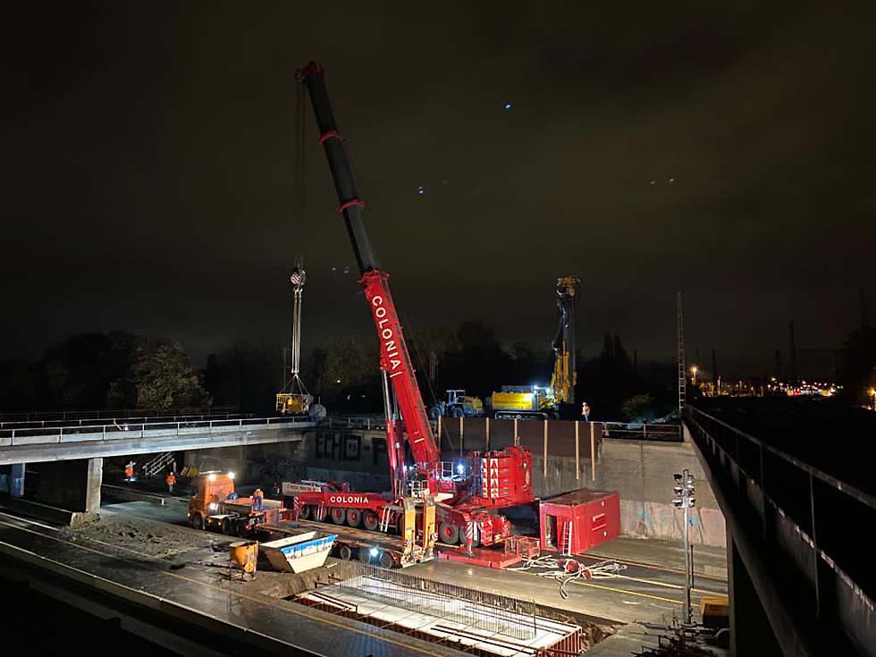 Nach dem schweren Lkw-Brand auf der Autobahn A 40 direkt unterhalb den Eisenbahnbrücken in Mülheim-Styrum startet die Deutsche Bahn (DB) im April mit den Arbeiten für den Einbau von zwei weiteren Hilfsbrücken. Die DB hatte die beiden Brücken für den Güterverkehr und die S-Bahn von und nach Oberhausen im Dezember abreißen müssen, nachdem Gutachter sie nicht mehr für den Eisenbahnverkehr freigeben konnten. In fünf Phasen baut die DB die Hilfsbrücken und macht sie für den Eisenbahnverkehr einsatzbereit. Insgesamt vier Widerlager müssen neu aufgebaut werden, die zwei Behelfsbrücken tragen. Dafür ist Großgerät notwendig, beispielsweise Bohrgeräte mit je 100 Tonnen Gewicht. Insgesamt 30 neue Bohrpfähle mit einem Durchmesser von mehr als einem Meter treibt die DB 26 Meter tief in den Boden, arbeitet die Bewehrungen ein und füllt die Löcher mit Beton. Auch für die Rammarbeiten, um Spundwände im Boden zu versenken und damit die Widerlager zu verankern, ist Großgerät oben auf der Baustelle im Einsatz. Um die großen Baugeräte auf die Baustelle zu heben, zu versetzen und wieder herunterzuheben, kommen wie bereits beim Bau der ersten Hilfsbrücke im letzten Jahr 750 Tonnen-Kräne zum Einsatz. Dann müssen die Autobahn und zweitweise auch die Eisenbahnstrecke von Essen nach Duisburg gesperrt werden. Denn sie verläuft mittig zwischen den beiden neu zu bauenden Hilfsbrücken. Die DB hat in enger Abstimmung mit der Autobahn GmbH den Bauablauf so eingetaktet, dass notwendige Sperrungen möglichst am Wochenende oder rund um Feiertage liegen, um die Auswirkungen auf Pendler:innen möglichst zu reduzieren. Außerdem nutzt die DB eine ohnehin geplante Sperrung für die Inbetriebnahme des elektronischen Stellwerks in Duisburg und weiterer umfangreicher Modernisierungsarbeiten. Der Einbau der Hilfsbrücken startet dann abends am 13. August. Neun Tage haben die Experten Zeit, um die beiden Brücken einzubauen, den beschädigten Asphalt zu erneuern und die Seitenwege neu zu pflastern. Besondere Herausforderung: Es sind zwei 750-Tonnen-Kran-Kolosse zeitgleich im Einsatz, die nebeneinander auf engstem Raum an beiden Hilfsbrücken arbeiten. Aber nur so kann die Sperrung auf der Autobahn und der Eisenbahnstrecke so kurz wie möglich gehalten werden. Am 6. September sollen die beiden Brücken dann in Betrieb gehen. Vorher werden noch Schienen, Schotter und Schwellen verlegt und die Oberleitungsanlage neu angeschlossen. Insgesamt liegt der Schaden bei einem mittleren zweistelligen Millionenbetrag. Über die Auswirkungen auf den Eisenbahnverkehr und die Autobahn informieren DB und Autobahn GmbH rechtzeitig. Für die Sperrung der Strecke zwischen Essen und Duisburg wird das bekannte Ersatzkonzept mit Umleitungen, Haltausfällen und Schienenersatzverkehr gefahren. Über Details informieren die Eisenbahn-Verkehrsunternehmen. Trotz des Einsatzes modernster Arbeitsgeräte ist Baulärm leider nicht zu vermeiden. Wir bitten die Anwohner:innen für alle Unannehmlichkeiten um Verständnis.