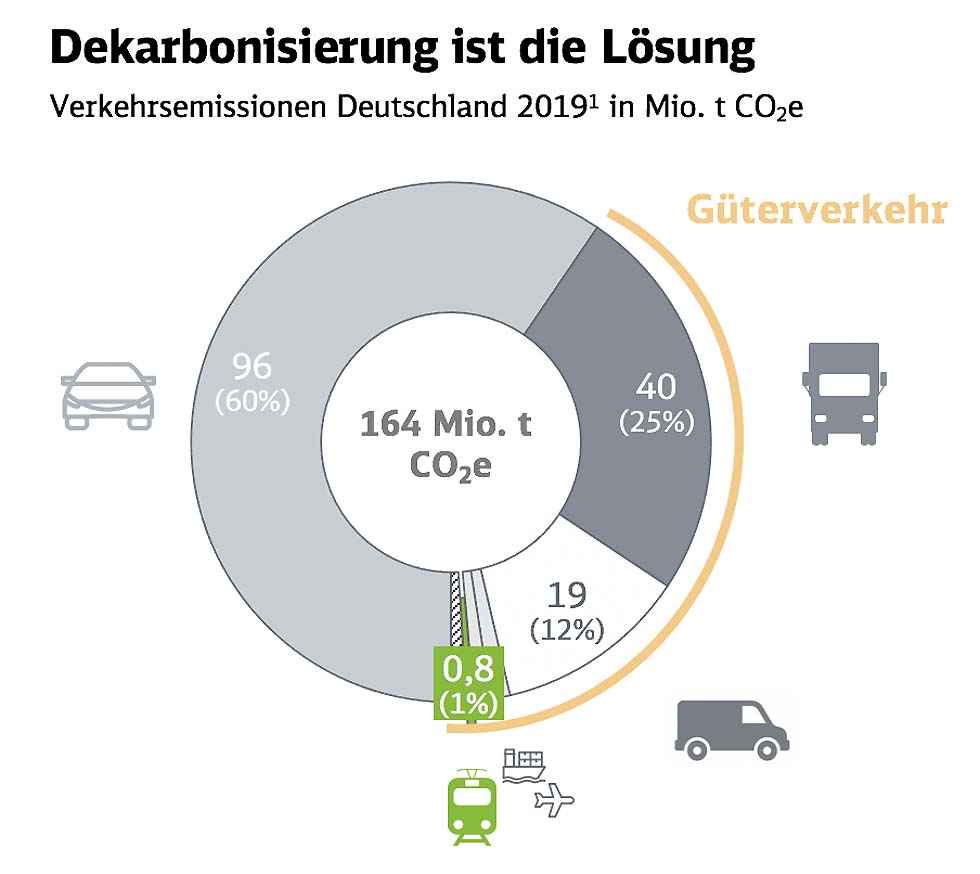 Mit rund 20 Prozent Anteil am CO2-Ausstoß ist der Verkehrssektor der drittgrößte Verursacher von Treibhausgasemissionen in Deutschland, nach der Energiewirtschaft und der Industrie. Rund ein Viertel des klimaschädlichen Gases entfällt dabei auf Schwerlaster. Experten zufolge wird die Verkehrsmenge auf deutschen Straßen in den kommenden Jahren sogar noch deutlich steigen. Gleichzeitig hat sich die Bundesregierung gemäß des Pariser Klimaschutzabkommens dazu verpflichtet, 42 Prozent CO2-Emissionen im Verkehrssektor gegenüber dem Referenzwert von 1990 einzusparen. Dekarbonisierung ist die Lo?sung Steigender Verkehr und sinkende Emissionen? Das erfordert langfristig einen Umstieg auf elektrisch betriebene Fahrzeuge und grüne Treibstoffe. Kurzfristig ließe sich das angestrebte Ziel erreichen, wenn der Gütertransport konsequenter als bislang auf die Schiene verlagert würde. Denn im Vergleich zu schweren Lkw verursachen Güterzuge etwa 80 Prozent weniger CO2. Ein einziger Zug könnte bis zu 52 schwere Lkw ersetzen. Schon heute holt DB Cargo jedes Jahr europaweit rund 22 Millionen Schwerlaster von der Straße. Die CO2-Einsparnis? 7 Millionen Tonnen jährlich.