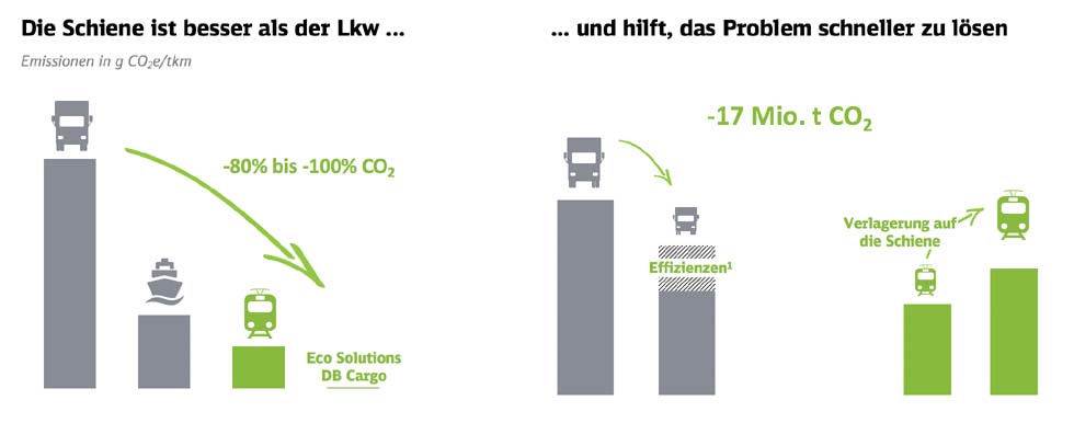 Konkrete Ziele der Initiative „Güter gehören auf die Schiene“ Um auf das Potenzial des klimafreundlichen Gütertransports aufmerksam zu machen, hat DB Cargo die Initiative „Güter gehören auf die Schiene“ gestartet. Damit verknüpft sind drei konkrete Ziele, mit denen die Verkehrswende gelingen kann: Umstellung der Wirtschaft auf möglichst CO2-freie Lieferketten DB Cargo schafft den „ICE für Güter“ – ein Netz von Verbindungen, das mehrmals täglich die wichtigsten Wirtschaftszentren Deutschlands bedient. Mit diesem System sichert das Unternehmen klimafreundlich und nachhaltig die Versorgung der Industrie und Gesellschaft mit Waren und Gütern in nahezu allen Regionen Deutschlands. Vereinfachung der klimafreundlichen Logistik. DB Cargo investiert in die Automatisierung und Digitalisierung von Prozessen, um die Abläufe entlang der Logistikkette zu beschleunigen. Digitale Informationssysteme machen grüne Logistik von der Buchung bis zur endgültigen Zustellung so einfach wie Online-Shopping. Intelligente Kombination von Schiene und Straße Der kombinierte Verkehr verbindet die Vorteile der klimafreundlichen Schiene mit der flexiblen Straßenlogistik: Lkw übernehmen dabei die „letzte Meile“ zwischen den Unternehmen und den Terminals von DB Cargo. Auf der Langstrecke kommen dann die Güterzüge zum Einsatz. DB Cargo plant, diesen kombinierten Verkehr so auszubauen, dass er bis 2030 mehr als 50 Millionen Tonnen CO2 einspart. Das entspricht dem jährlichen Ausstoß eines großen Steinkohlekraftwerks.