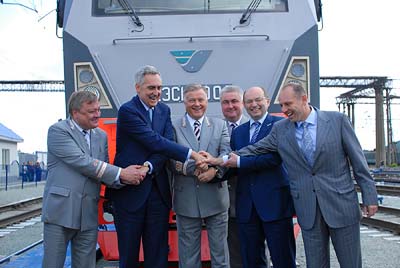 Rekord: Siemens-Lok fährt mit 9.000 Tonnen über den UralIm August hat eine aus drei Sektionen bestehende Güterlok dieses Typs eine weitere Feuertaufe bestanden und bei einer Testfahrt die Nutzlast von 9.000 Tonnen über das Uralgebirge gezogen – ein neuer Lasten-Rekord in der 1520-Eisenbahnregion. Die Fahrt ging von Jekaterinburg, wo die Loks im Werk des Joint-Ventures Ural Locomotives gebaut werden, über den Ural ins rund 500 Kilometer entfernte Balesino. Den Auftrag über 221 Granit-Lokomotiven hatten die Russischen Eisenbahnen (RZD) im Mai 2010 an Ural Locomotives vergeben. Siemens investiert jetzt mehr als 200 Millionen Euro zusätzlich in den Standort, um dort die Produktion von 1.200 Wagen für den Regionalzug Desiro RUS auszubauen, die die RZD jüngst im September bestellt haben. Zum Bild: Feierten gemeinsam die erfolgreiche Rekordfahrt der 2ES10-Lok über das Uralgebirge (von links): Valentin Gapanovich, Vizepräsident der RZD; Peter Löscher, Vorstandsvorsitzender der Siemens AG; Vladimir Yakunin, Präsident der RZD; ein weiterer Vertreter der RZD; Aleksandr Misharin, Bürgermeister von Jekaterinburg; Dmitry Pumpyanskiy, Präsident von Sinara. (Bildquelle: RZD-Archiv, Russland) Quelle:/Fotos: Siemens | |