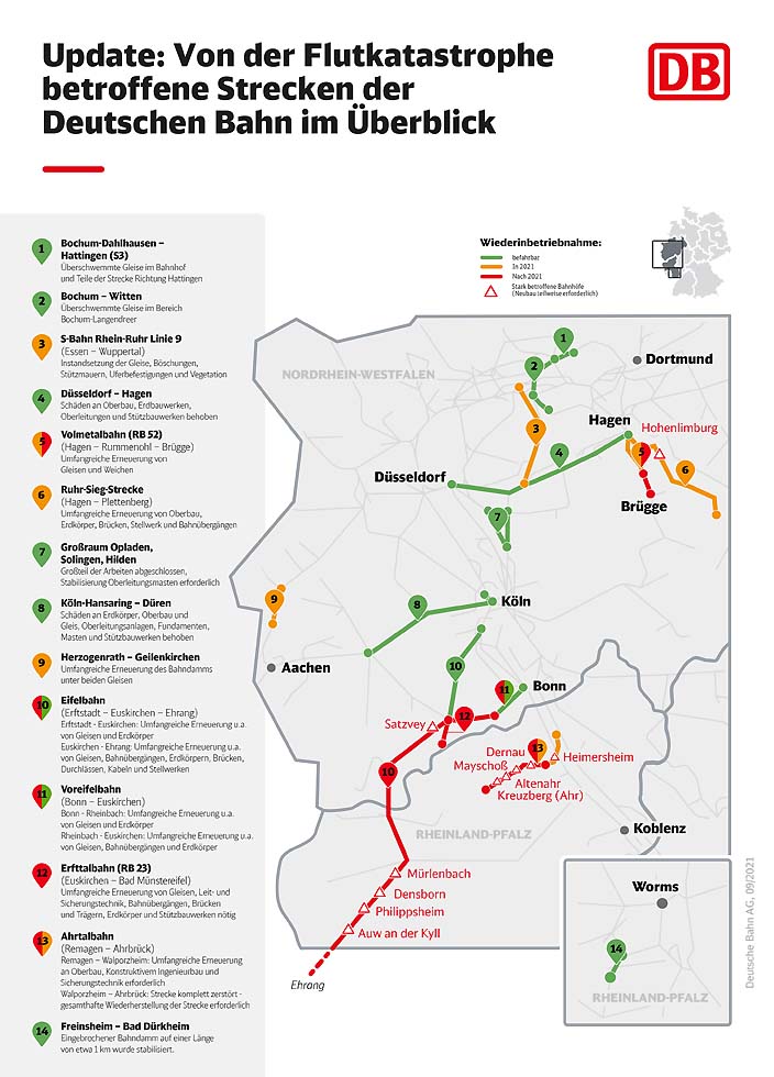 Zwei Monate nach den schweren Unwettern in Rheinland-Pfalz und Nordrhein-Westfalen hat die Deutsche Bahn (DB) für die Eifelstrecke einen konkreten Zeitplan entwickelt. Das Ziel: Für die Kundinnen und Kunden bis zum Sommer 2023 eine erste Befahrbarkeit der gesamten Strecke erreichen. Die Teams von DB und Fachfirmen bauen in den beiden Bundesländern in mehreren Abschnitten parallel die beschädigte Eisenbahninfrastruktur wieder auf. Da die Flutschäden auf den einzelnen Streckenabschnitten unterschiedlich stark ausgeprägt sind, ergibt sich folgender Zeitplan: In Rheinland-Pfalz sollen noch Ende des Jahres zwischen Ehrang und Auw wieder erste Züge rollen. Im Frühjahr 2022 will die DB dann die Strecke bis Kyllburg auf Vordermann bringen. Im Sommer folgt der Abschnitt nach Gerolstein, anschließend die Strecke nach Nettersheim. In Nordrhein-Westfalen plant die DB, den Bahnverkehr zwischen Euskirchen und Mechernich bis zum nächsten Frühjahr wieder aufzunehmen. Der Abschnitt bis Kall folgt bis zum Sommer 2022. Zwischen Kall und Nettersheim wird dann bis Sommer 2023 die Strecke umfassend erneuert. Die Dauer für die vollständige Wiederherstellung der Bahnübergänge in Rheinland-Pfalz und aller Strecken und Bauwerke in NRW können die Fachleute derzeit noch nicht abschließend beziffern. Auf der Ahrtalbahn geht es ebenfalls voran: Zum Jahresende fahren die Züge wieder auf einem Gleis zwischen Remagen und Walporzheim. Dafür erneuert die DB aktuell Schienen, Bahndämme und die Technik. Die Instandsetzung des zweiten Gleises ist aufwändiger und benötigt mehr Zeit. Auch im weiteren Verlauf der Ahrtalbahn arbeitet die DB weiter daran, die Folgen der Flutkatastrophe zu beseitigen. Unter anderem mussten zwei einsturzgefährdete Brücken bei Ahrbrück abgerissen werden. Parallel laufen erste Planungen für die Rundum-Erneuerung der Infrastruktur. Konkrete Prognosen zur Wiederinbetriebnahme sind hier ebenso wie für die Strecken Euskirchen – Bad Münstereifel (Erfttalbahn) sowie Rheinbach – Euskirchen (Teilstrecke der Voreifelbahn) noch nicht möglich. Bei den Planungen für den Wiederaufbau der Eisenbahninfrastruktur steht die Deutsche Bahn im engen Austausch mit Bund, Ländern und Gemeinden. Dabei werden die Beteiligten zum Beispiel auch den Einbau modernerer Technik bei Stellwerken und Bahnübergängen realisieren. Eine klimaresilientere Bauweise bei den neu zu errichtenden Brücken und Bahndämmen ist ebenfalls ein Thema. Parallel werden gemeinsam Möglichkeiten für ein noch höheres Tempo bei der Planung und Umsetzung der Bauarbeiten konzipiert.